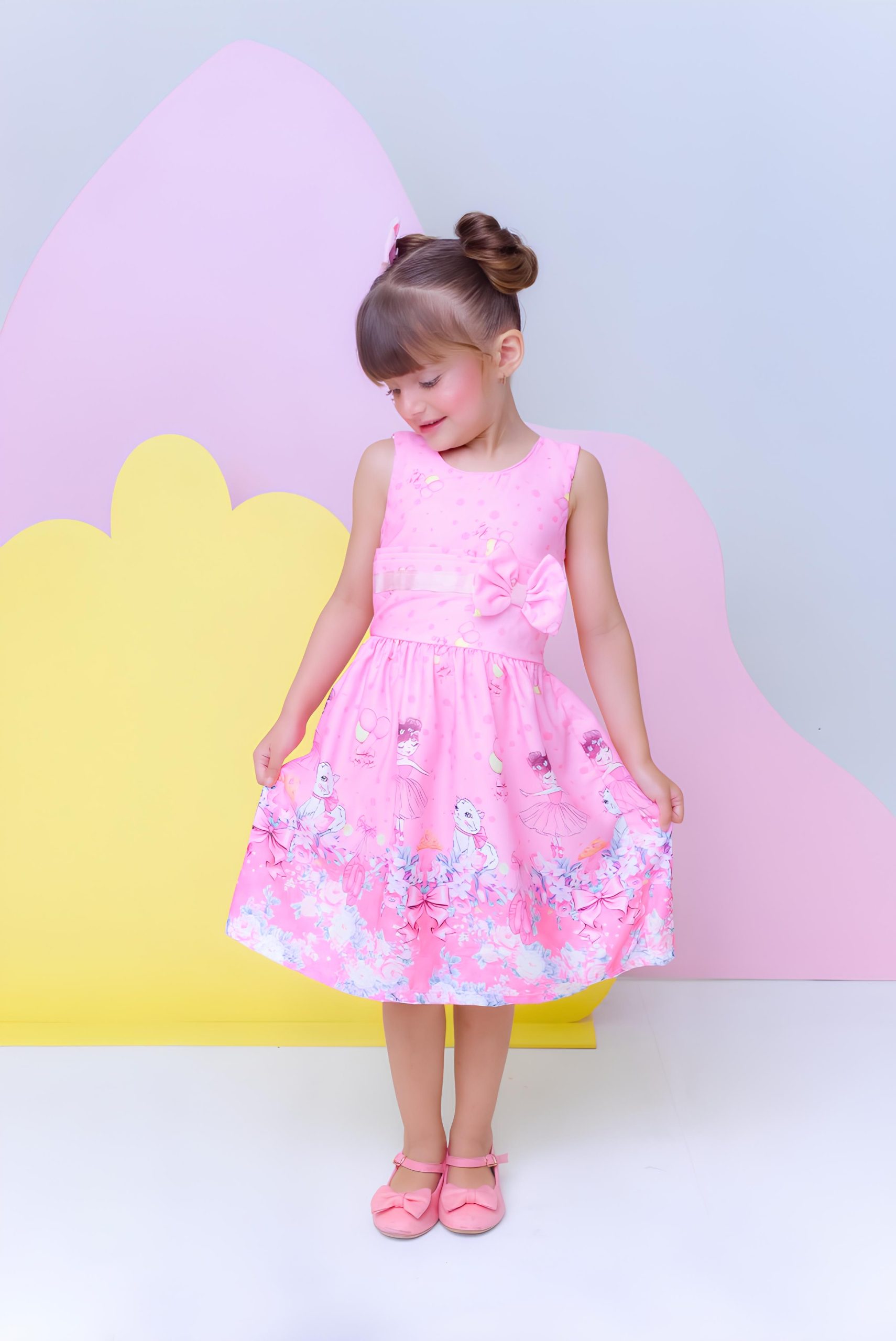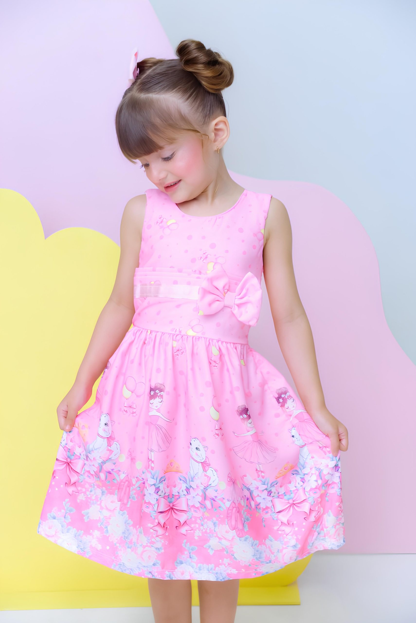 Vestido infantil em microfibra digital, com um charme todo especial: são 3 preguinhas delicadas no peito, fita de gorgurão e laço duplo bem estruturado, que deixam o visual elegante e cheio de cuidado em cada detalhe. A saia possui preguinhas que criam um leve rodado e um barrado diferenciado, enquanto o lastex nas costas se ajusta ao corpo, garantindo caimento perfeito e muito conforto para a criança brincar à vontade. 💖