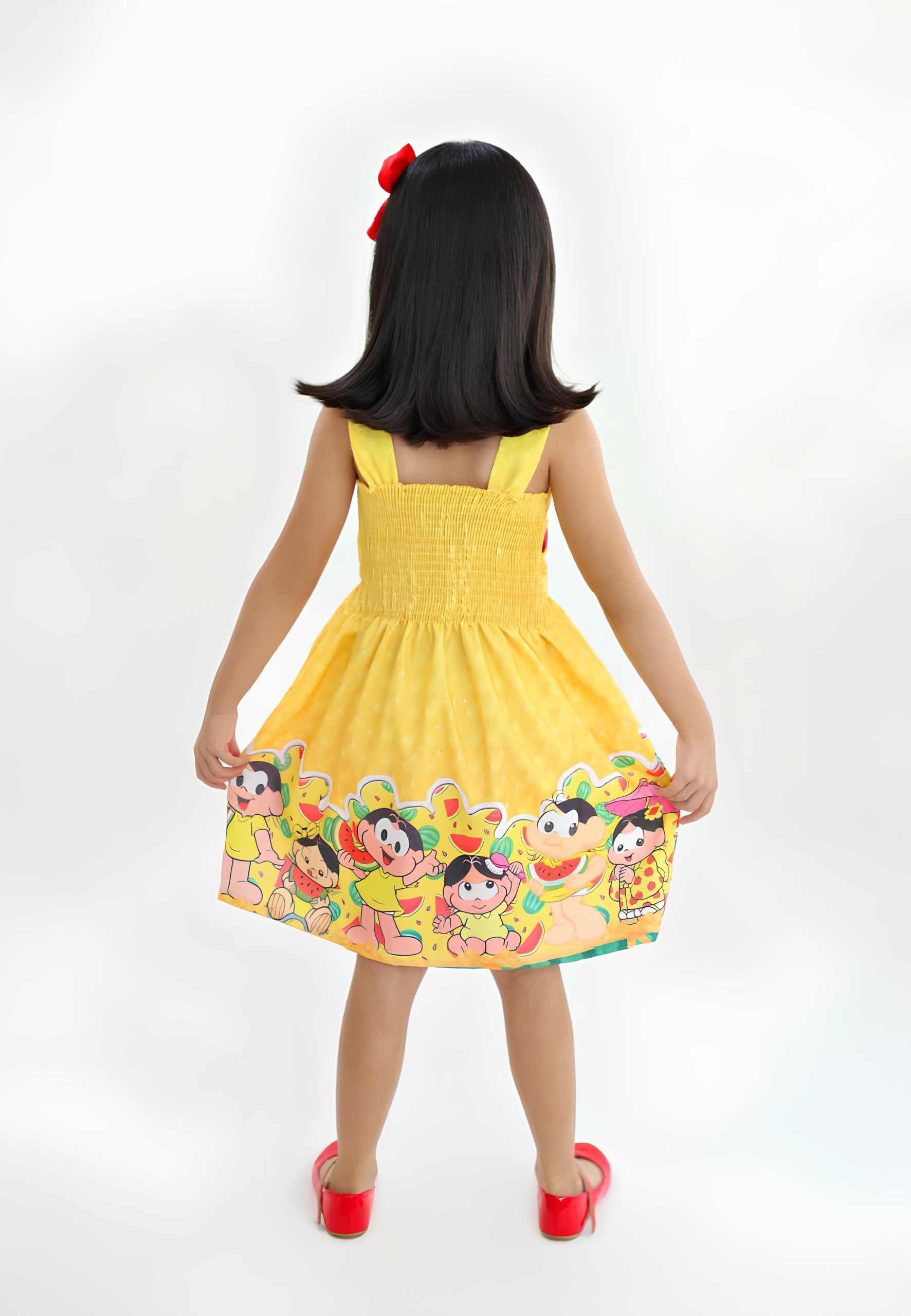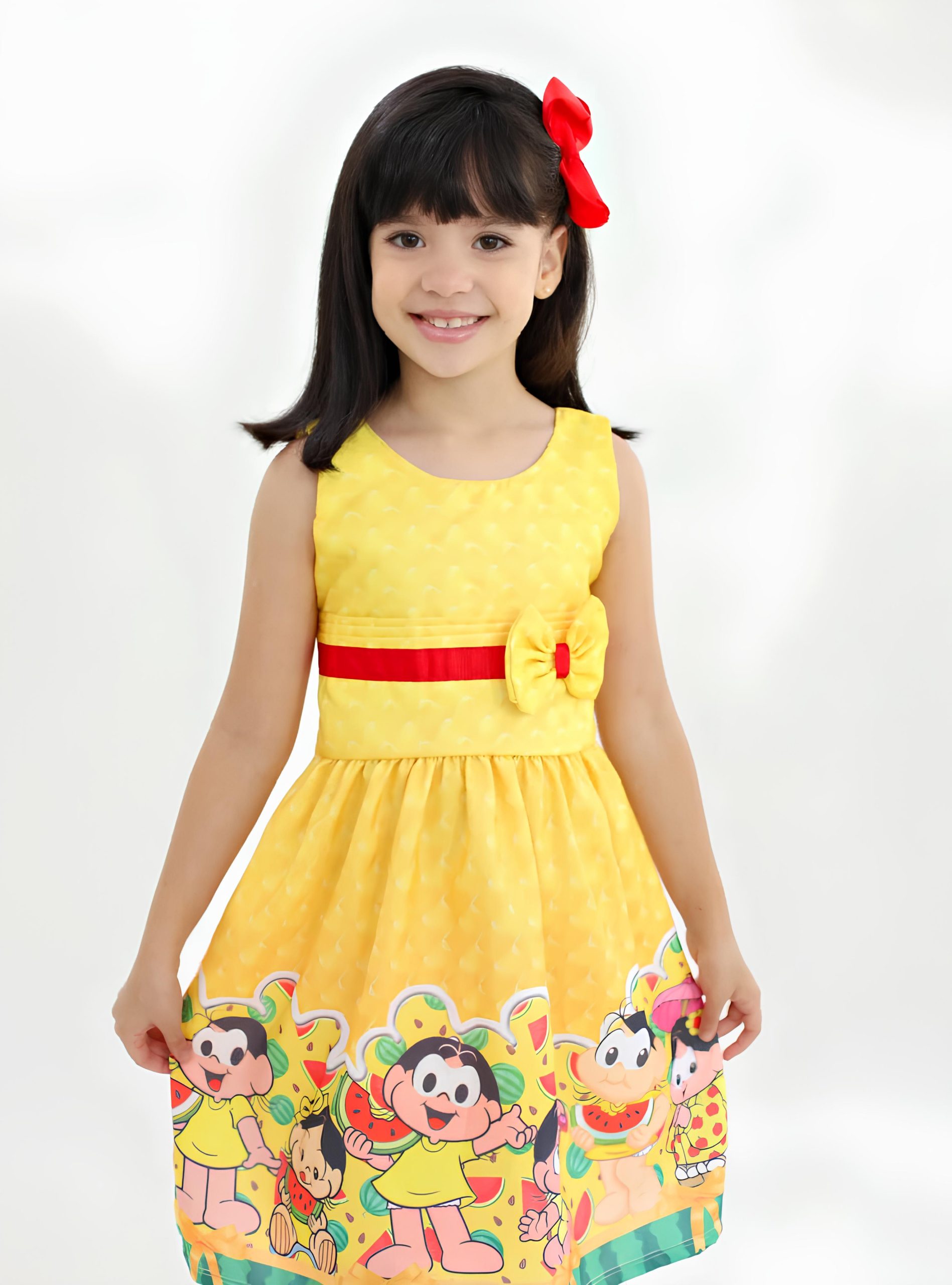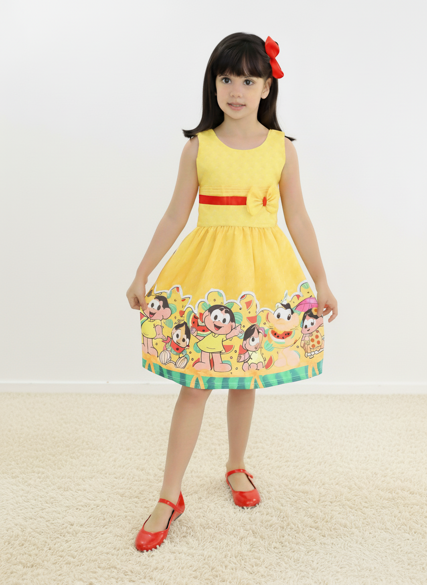 Vestido infantil em microfibra digital, com um charme todo especial: são 3 preguinhas delicadas no peito, fita de gorgurão e laço duplo bem estruturado, que deixam o visual elegante e cheio de cuidado em cada detalhe. A saia possui preguinhas que criam um leve rodado e um barrado diferenciado, enquanto o lastex nas costas se ajusta ao corpo, garantindo caimento perfeito e muito conforto para a criança brincar à vontade. 💖