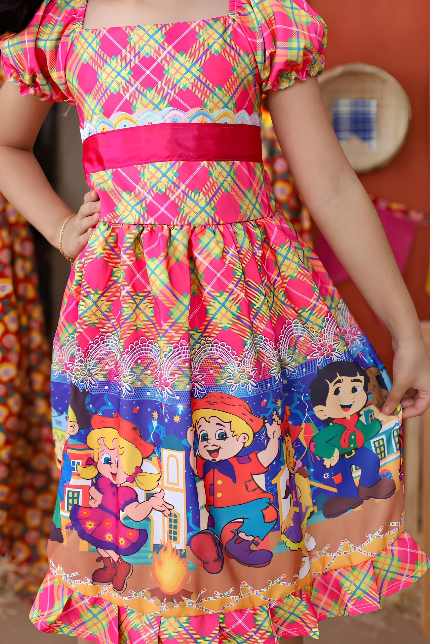 • Detalhes: Mangas bufantes e barra estampada com tema junino, trazendo aquele charme todo especial das festas de São João